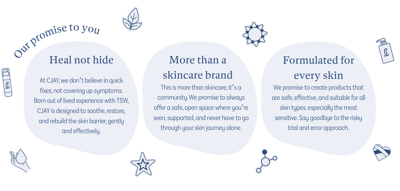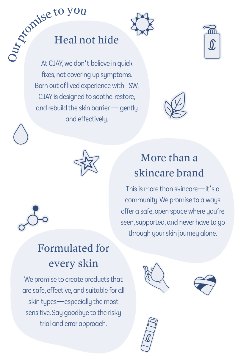 CJAY Skincare was born out of a need for gentle, effective support for skin going through Topical Steroid Withdrawal (TSW). Unlike conventional products, CJAY is formulated with simple, restorative ingredients to calm, nourish, and protect the skin during one of its most vulnerable healing journeys.